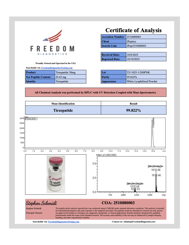 Each batch of JPT-G2 comes with a complete Certificate of Analysis showing: